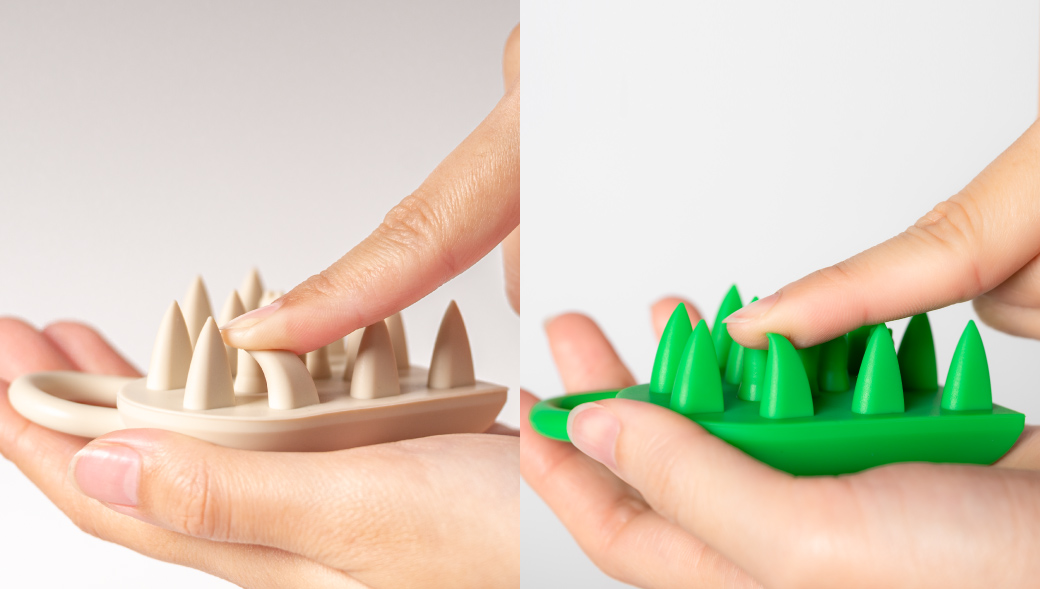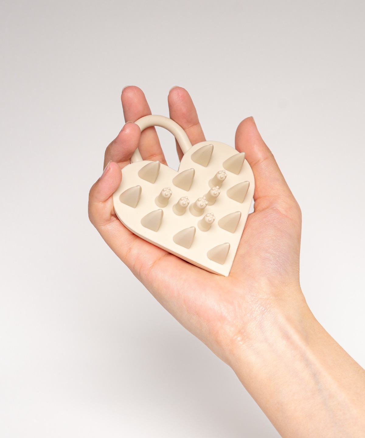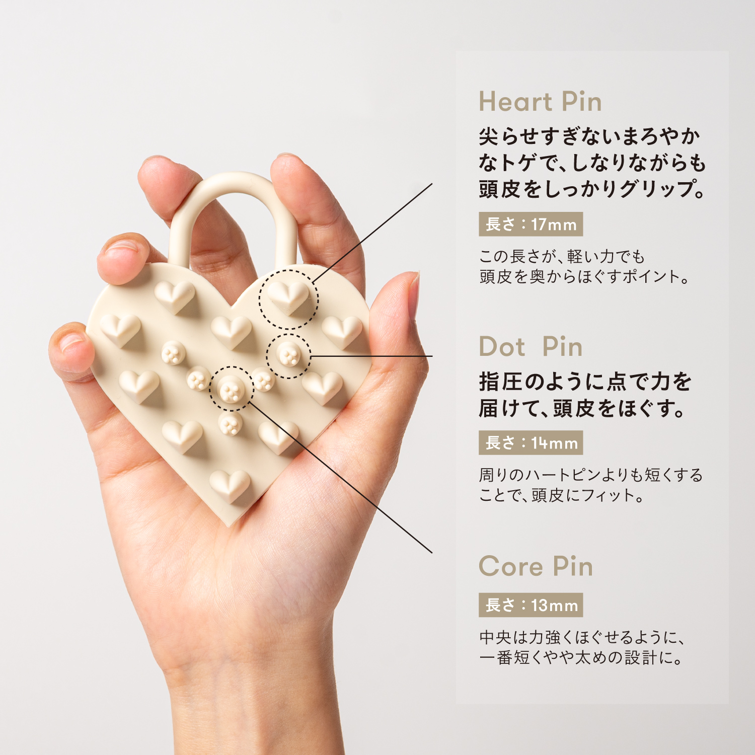 ハート型のピンがしなるように頭皮を掴み、中央のピンが指圧のように頭皮をほぐすことで、心地よいスッキリとしたマッサージを叶えます。ピンの硬さは通常のスカルプブラシ(グリーン/ピンク)よりもソフトタイプです。
