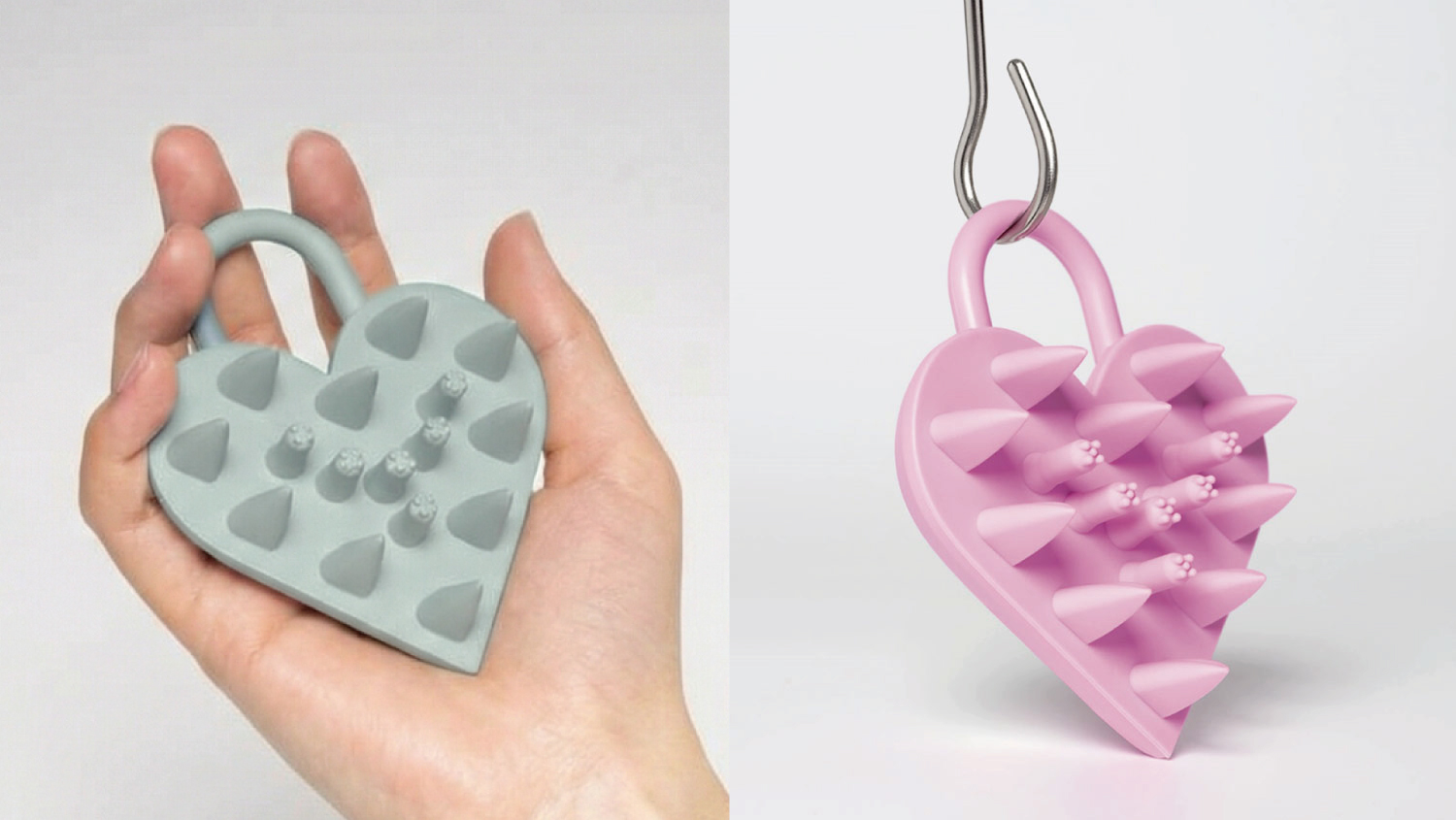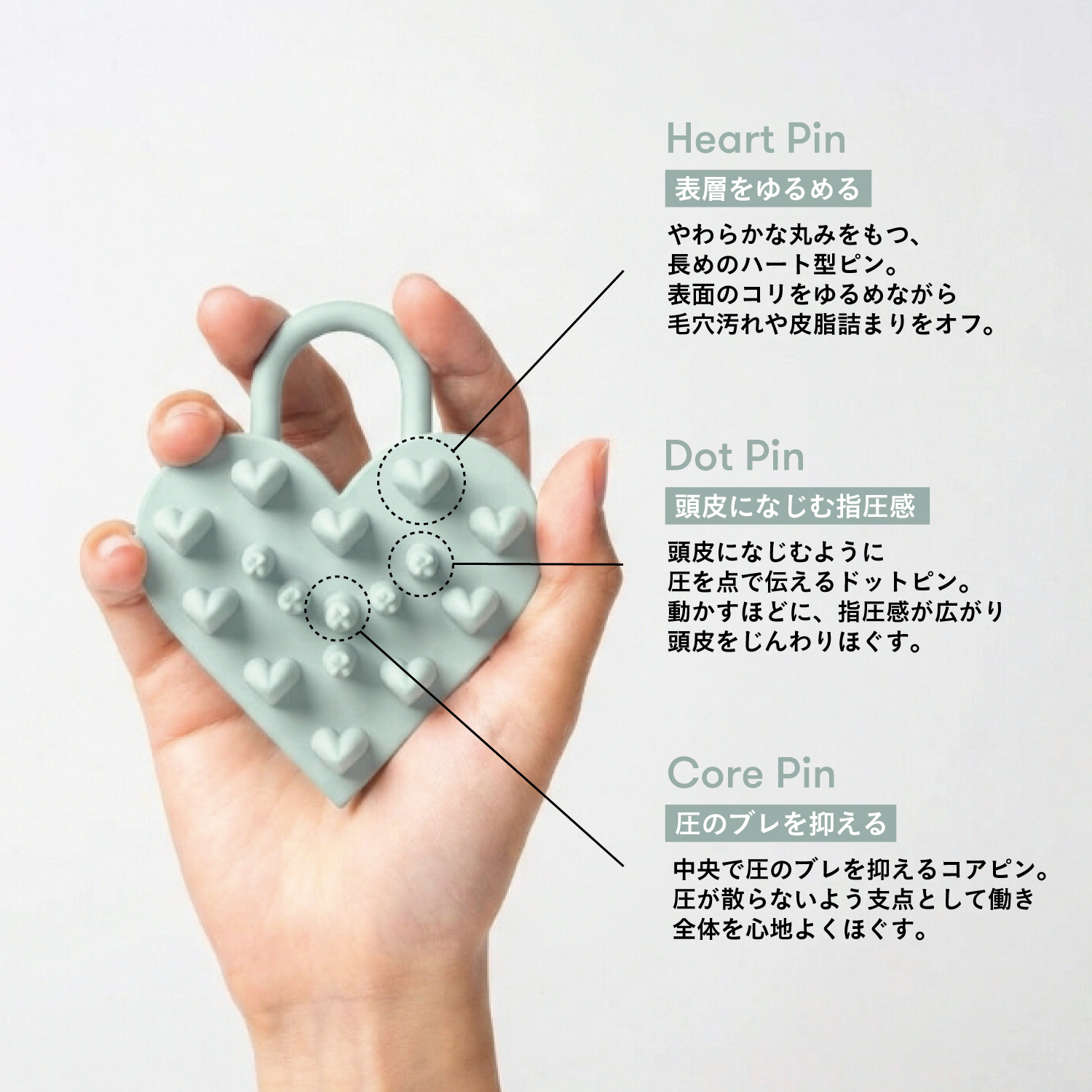 ハート型のピンがしなるように頭皮を掴み、中央のピンが指圧のように頭皮をほぐすことで、心地よいスッキリとしたマッサージを叶えます。